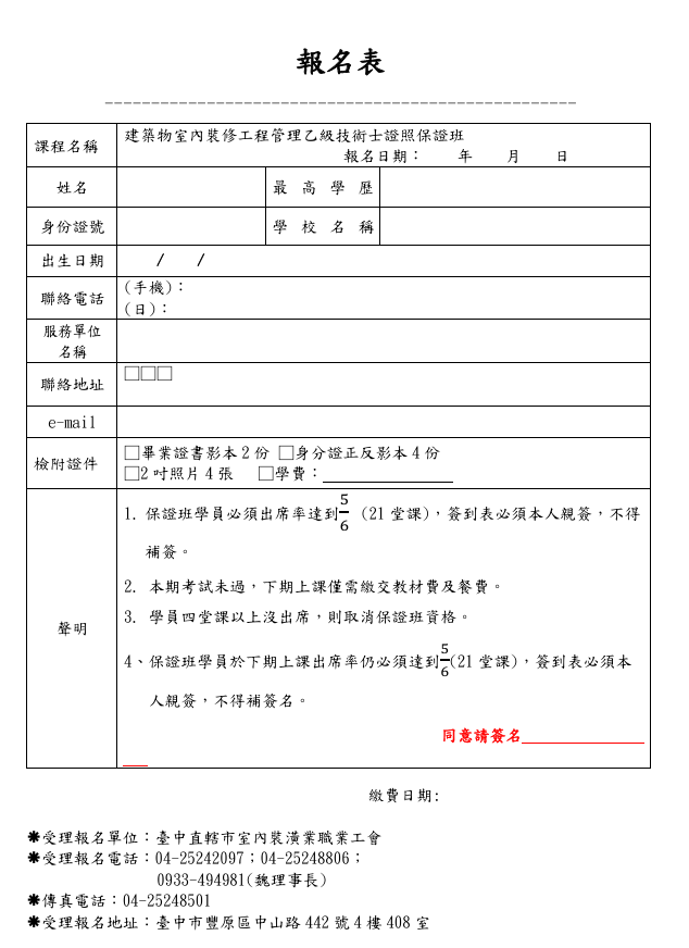 ●7、保證班學員於下期上課出席率仍必須達到5/6(21堂課),簽到表必須本人親簽,不得補簽名,考試若仍未過,下下期上 課僅需繳交教材費及餐費。
